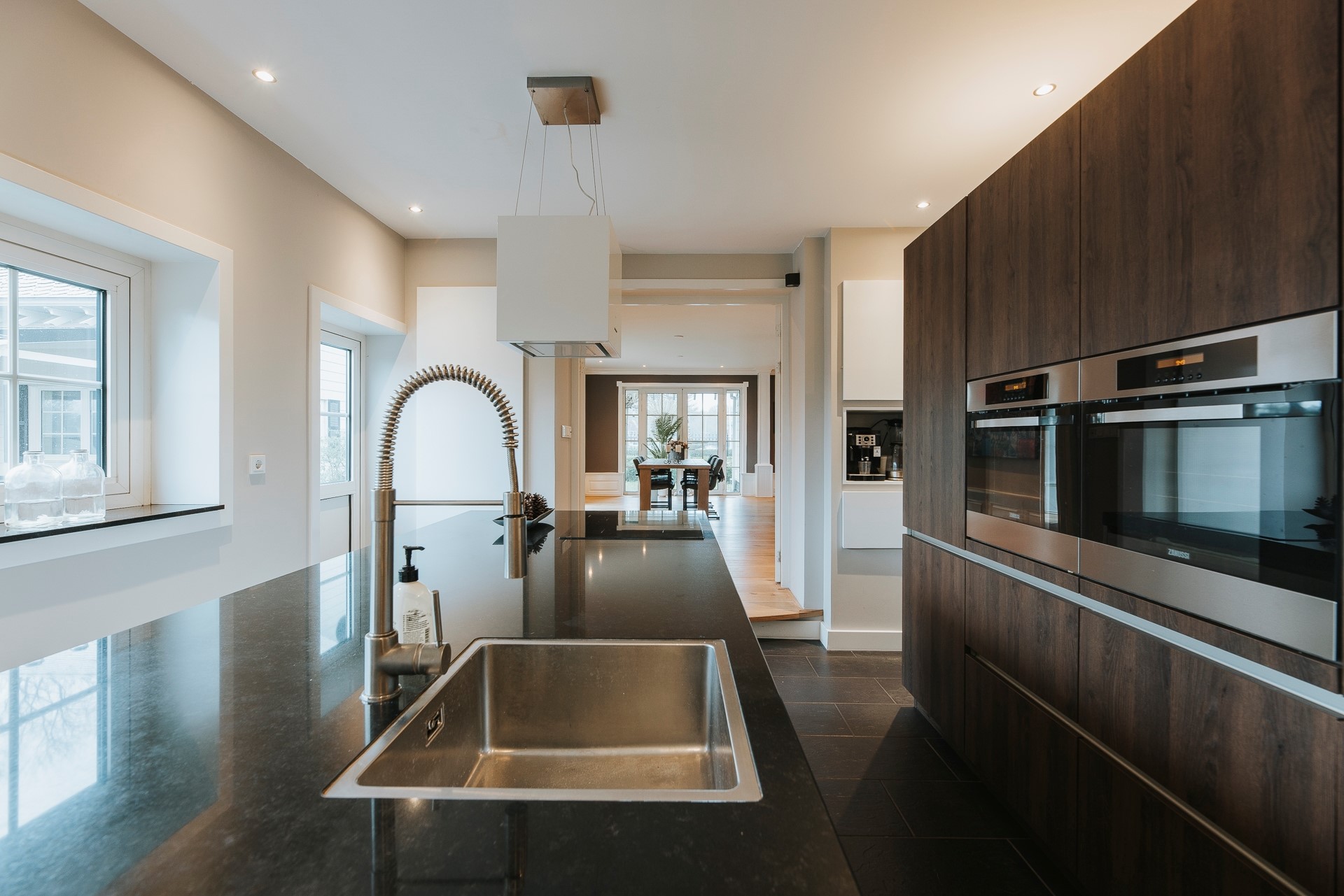 Middels openslaande deuren toegang tot een prachtige keuken voorzien van kookeiland en alle inbouwapparatuur.
