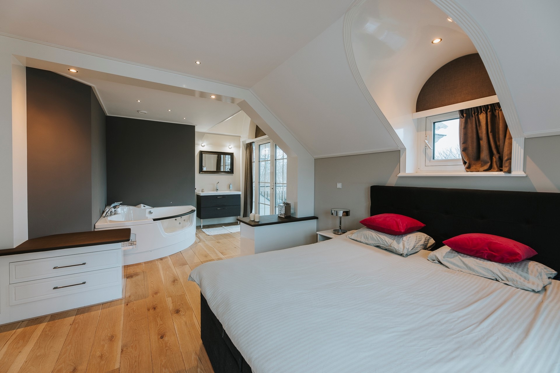 De hoofd slaapkamer heeft een eigen badkamer, deze badkamer is voorzien van heerlijk bubbelbad en wastafel meubel met spiegel.