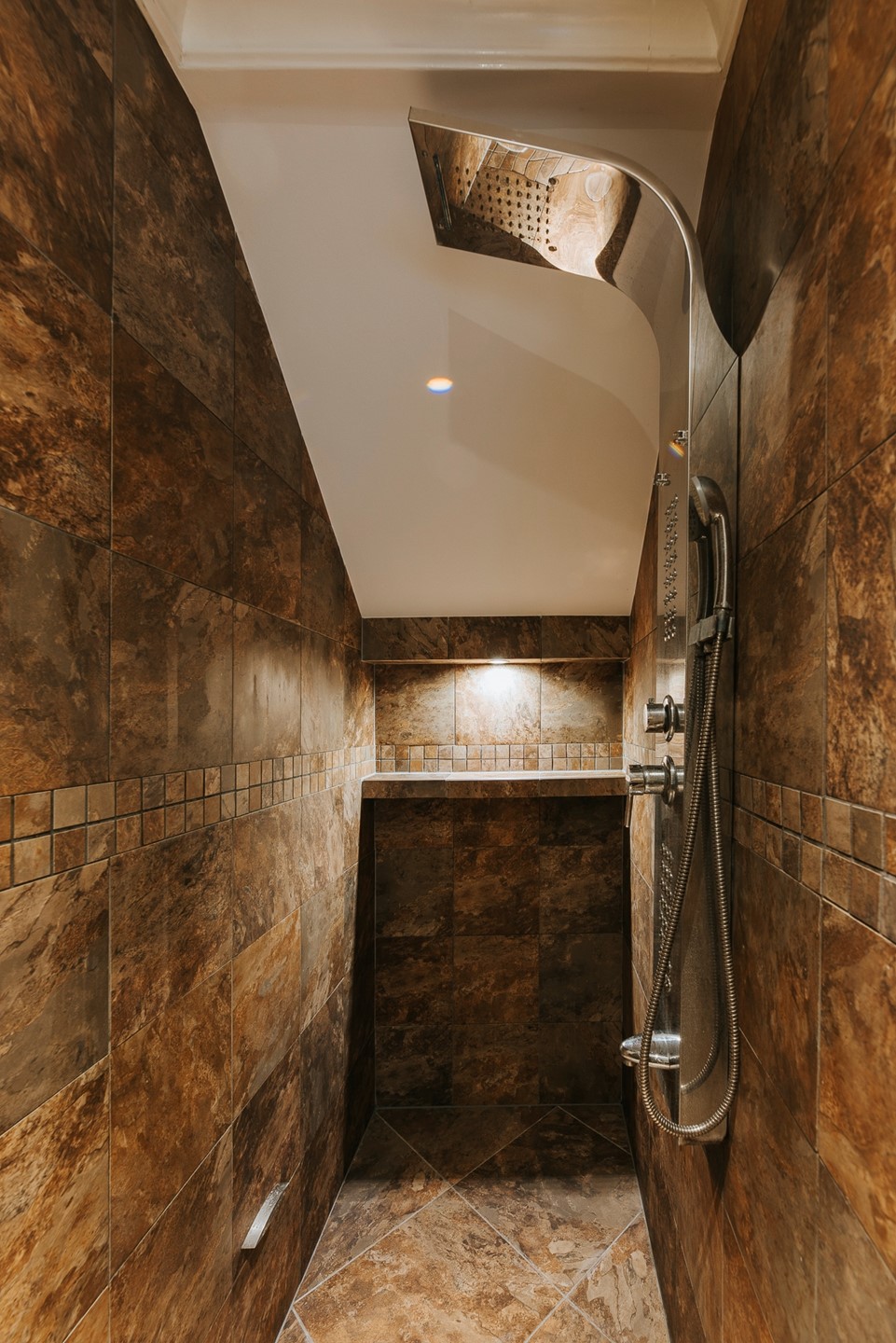 Badkamer is voorzien van een luxe inloopdouche, toilet en wastafel meubel met spiegel