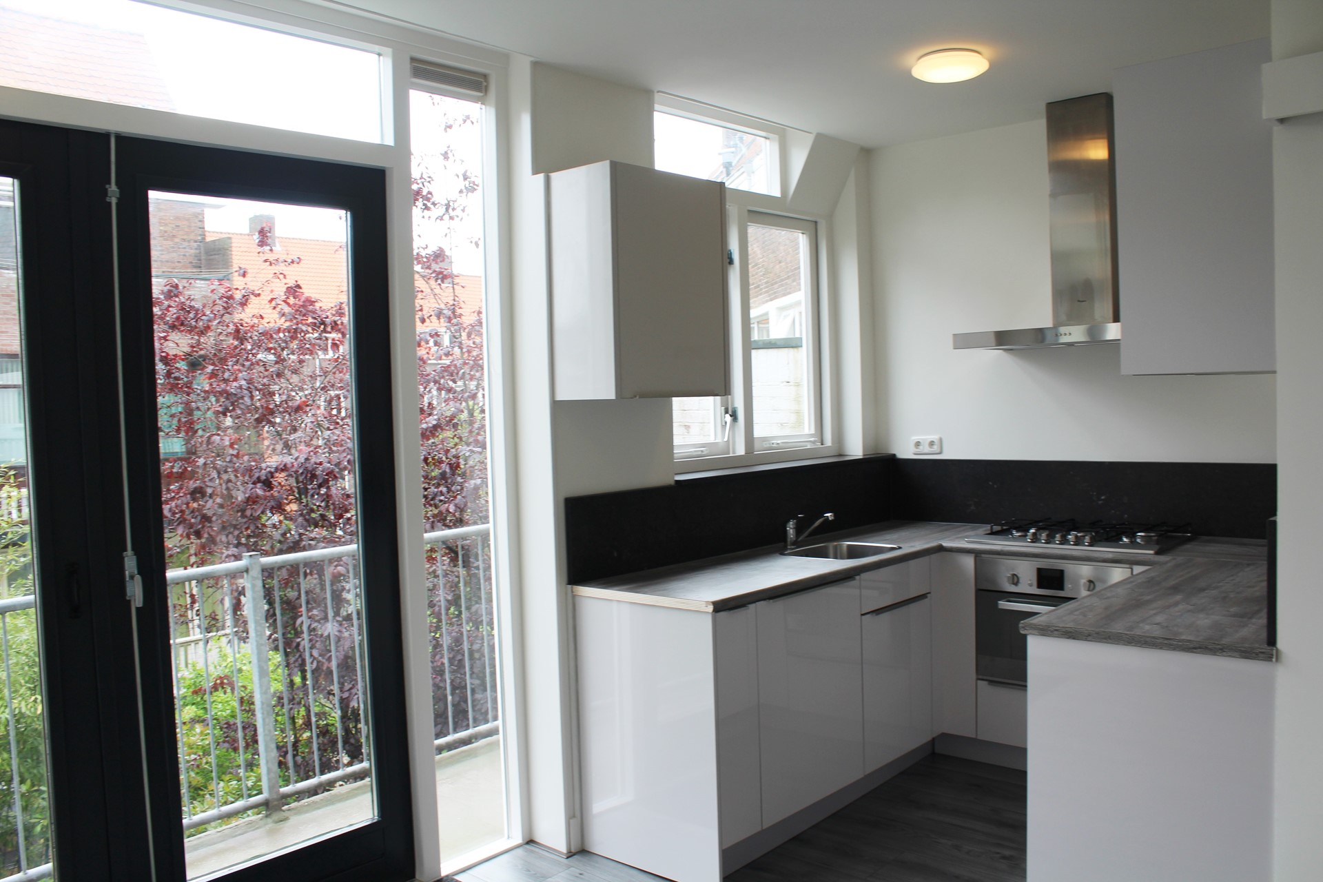 Ruime hal met toegang tot de woonkamer en een separaat toilet. De lichte doorzonwoonkamer profiteert van een mooie natuurlijke lichtinval dankzij de karakteristieke erker. De halfopen keuken is voorzien van een modern keukenblok, uitgerust met onder andere een 5-pits gasfornuis met RVS afzuigkap, koelkast met vriesvak en een vaatwasser. Via de stijlvolle openslaande deuren is er toegang tot het ruime balkon.