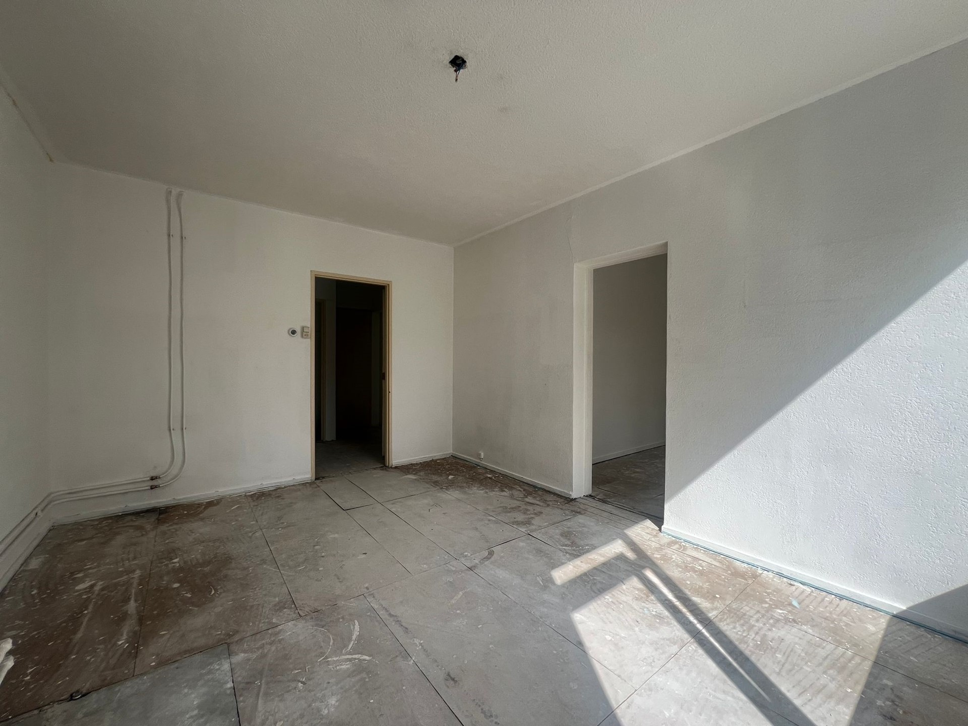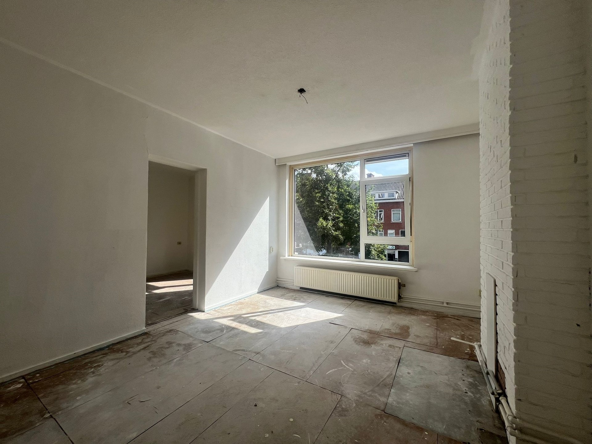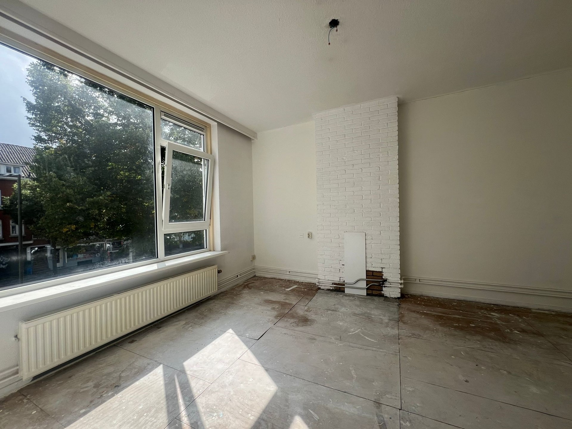 De lichte woonkamer is gelegen aan de voorzijde van het appartement.