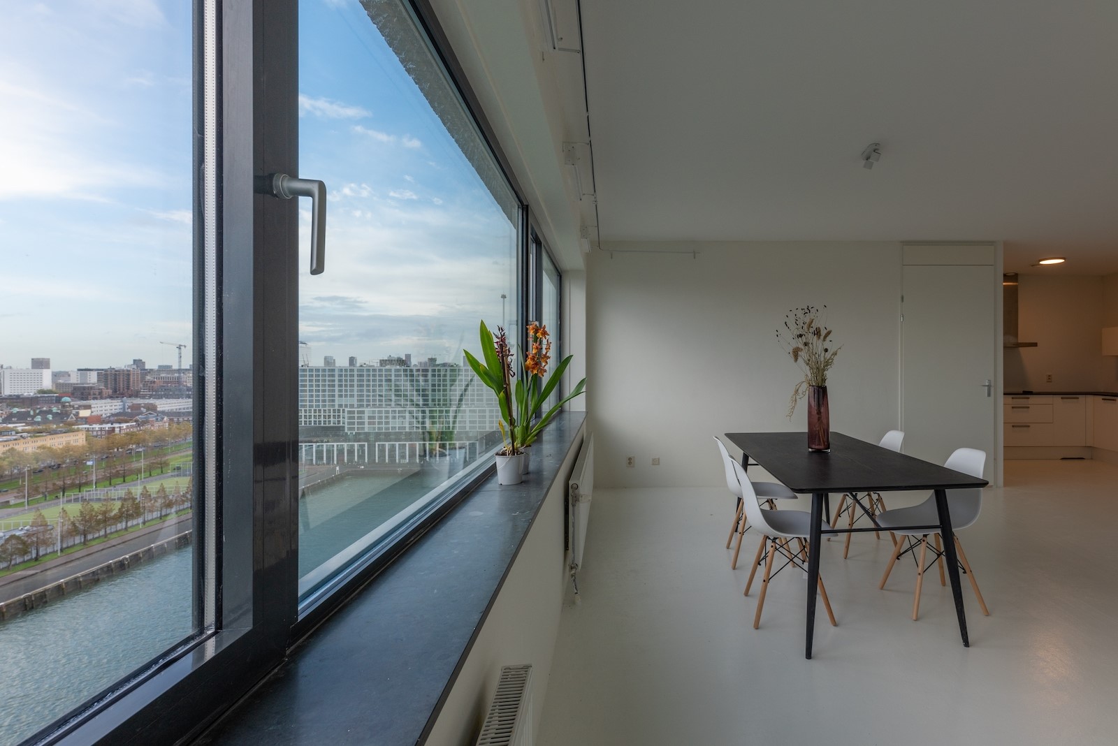 Dit ruime appartement is gelegen op de 17e verdieping. Achter de voordeur ervaart u de rust en ruimte die het appartement u te bieden heeft. Deze woning is gelegen in de waterrijke wijk van Rotterdam centrum: het Lloydkwartier. Direct gelegen aan de Maas en grenzend aan de Parkhaven, Schiehaven en de Sint-Jobshaven. De vergezichten, wolkenpartijen en de drukte op het water vervelen nooit en geven de wijk haar dynamische karakter.