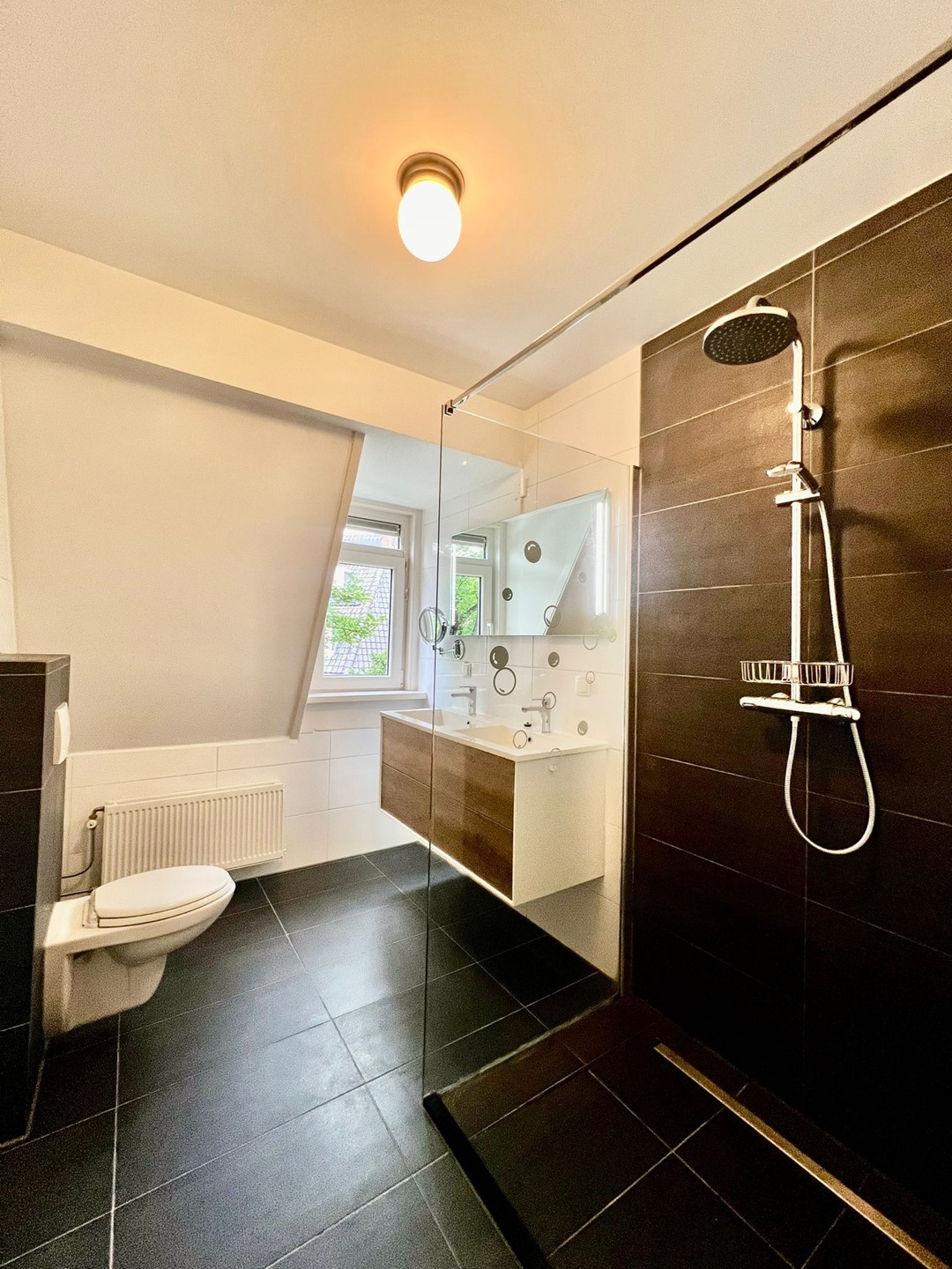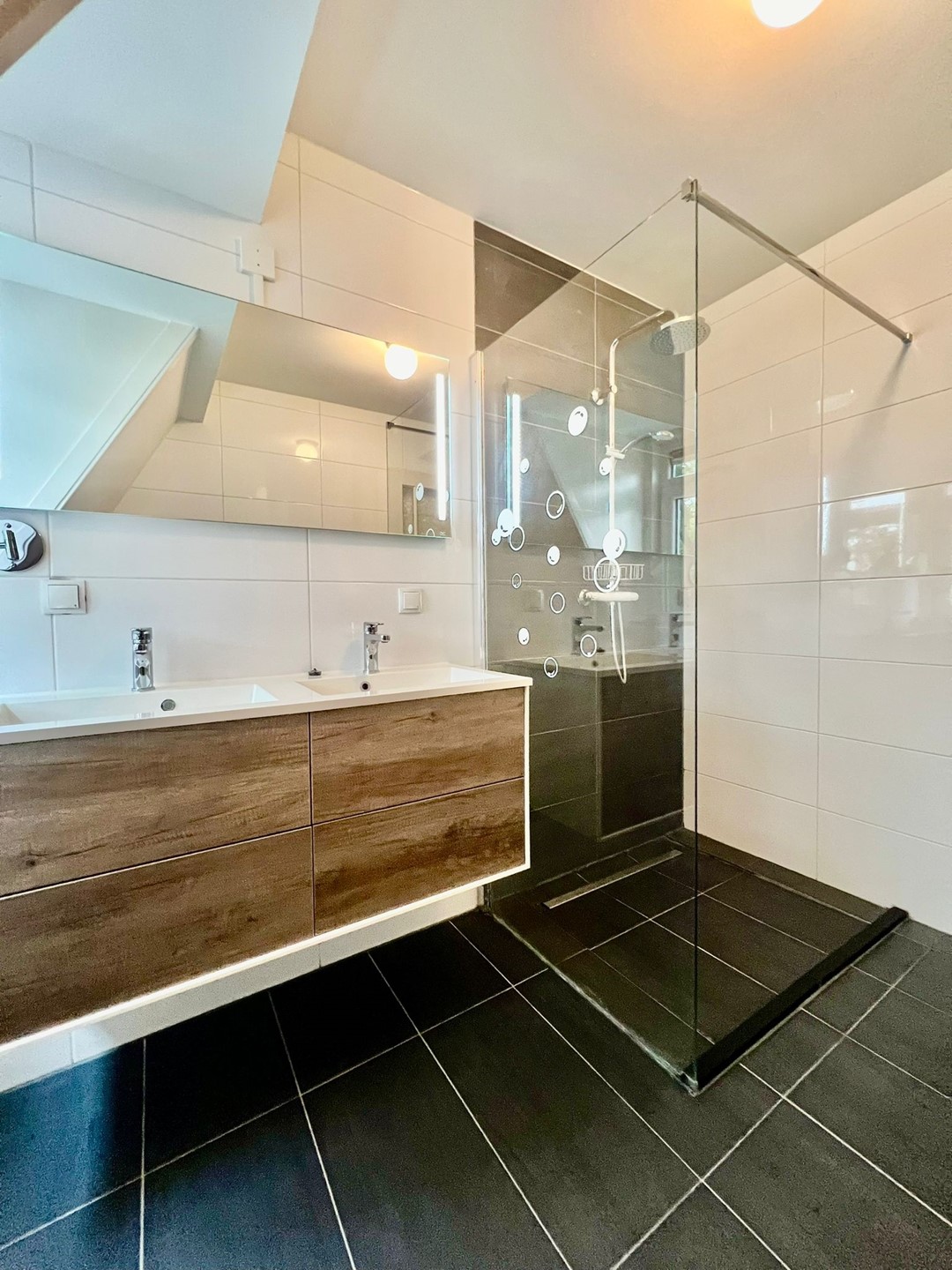 Slaapkamer 1, badkamer voorzien van toilet, dubbele wastafel en een inloopdouche.