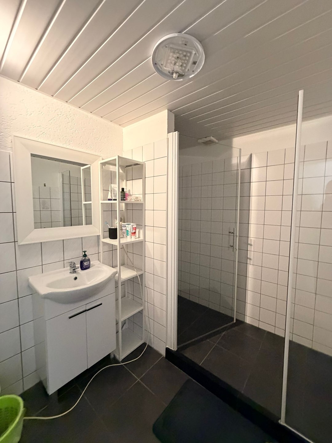 Badkamer zit tussen de 2 slaapkamers in, badkamer is voor zien van inloopdouche, wastafelmeubel met spiegel, radiator en aansluiting voor de wasmachine
